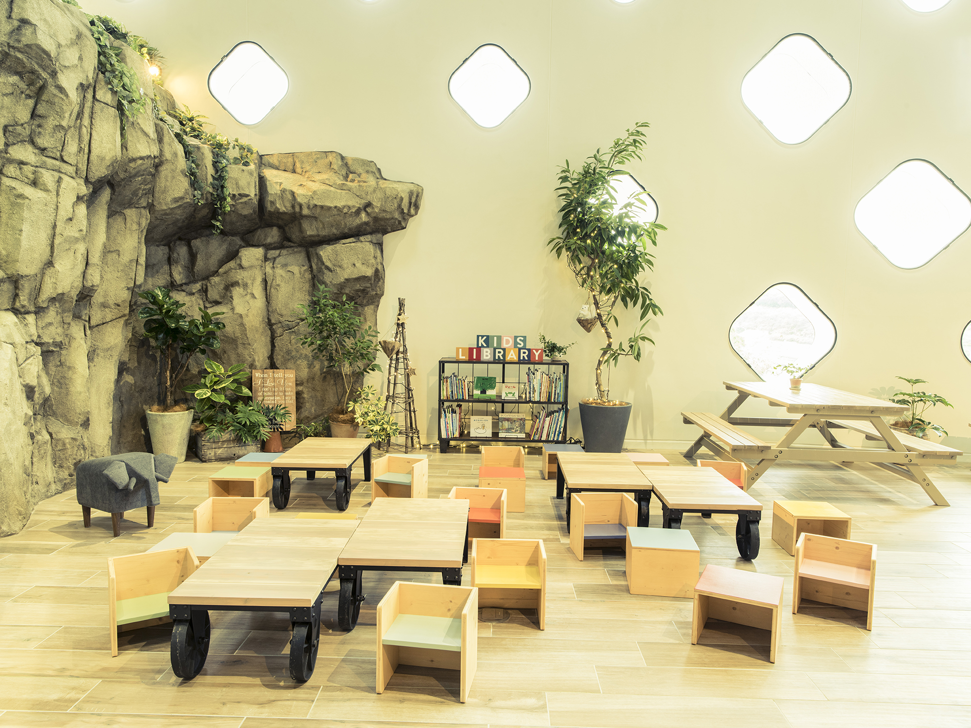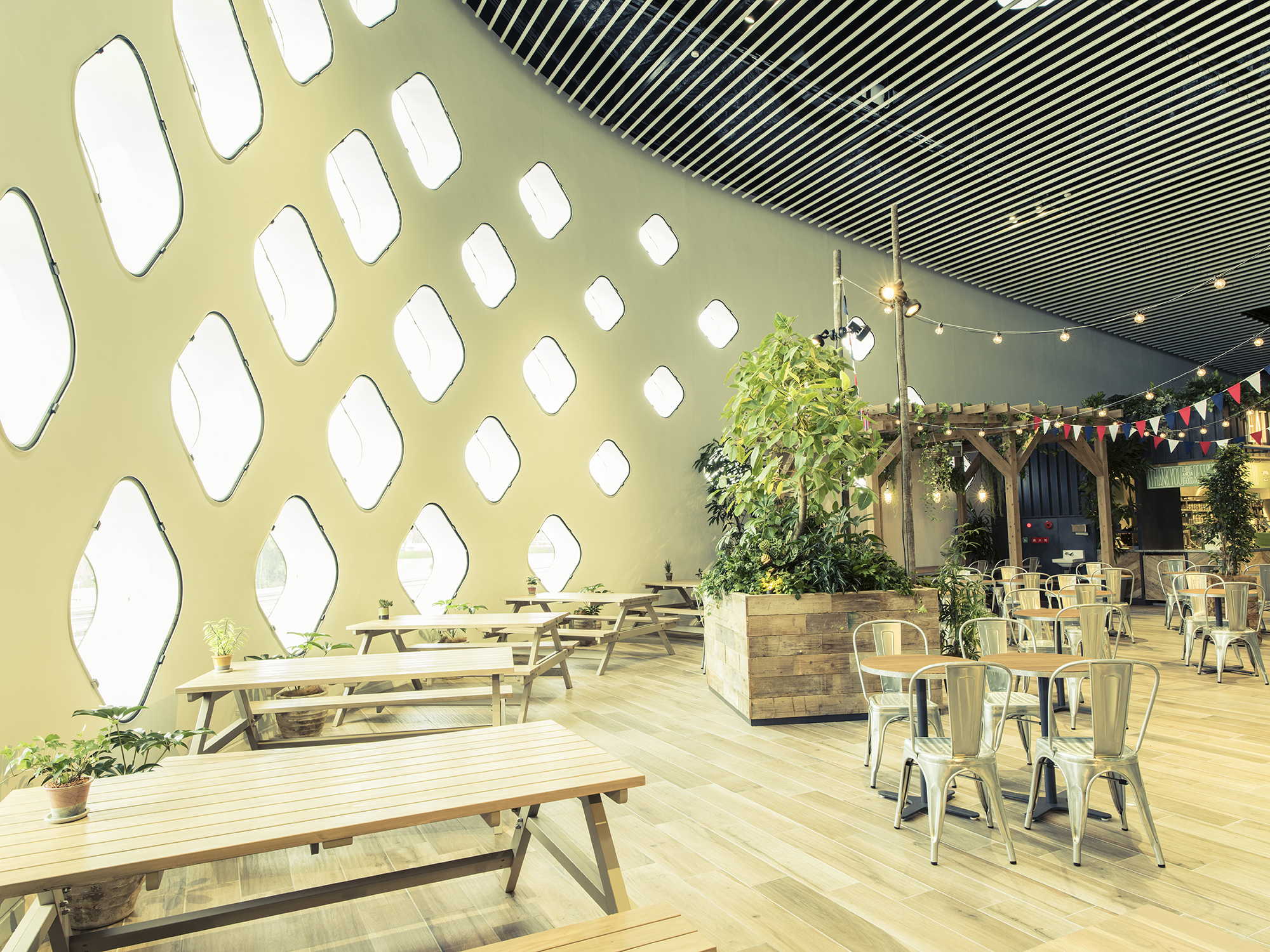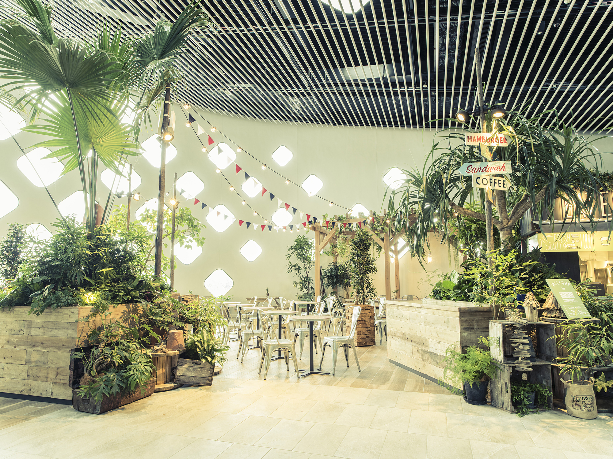 「感性にふれる」という施設コンセプトのもと、ピクニックをテーマに、たくさんの植物と動物たちに囲まれた空間で食事が楽しめる。