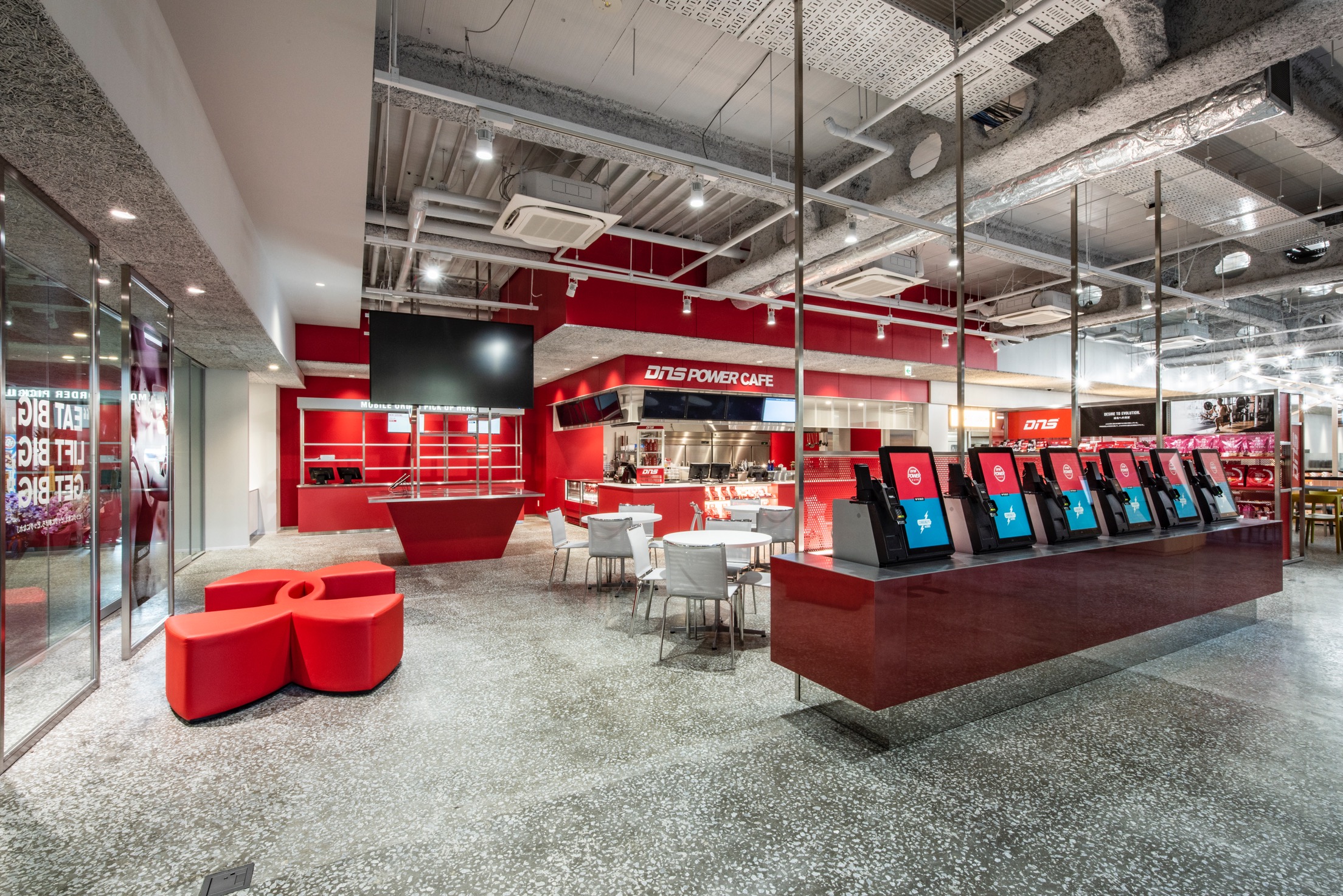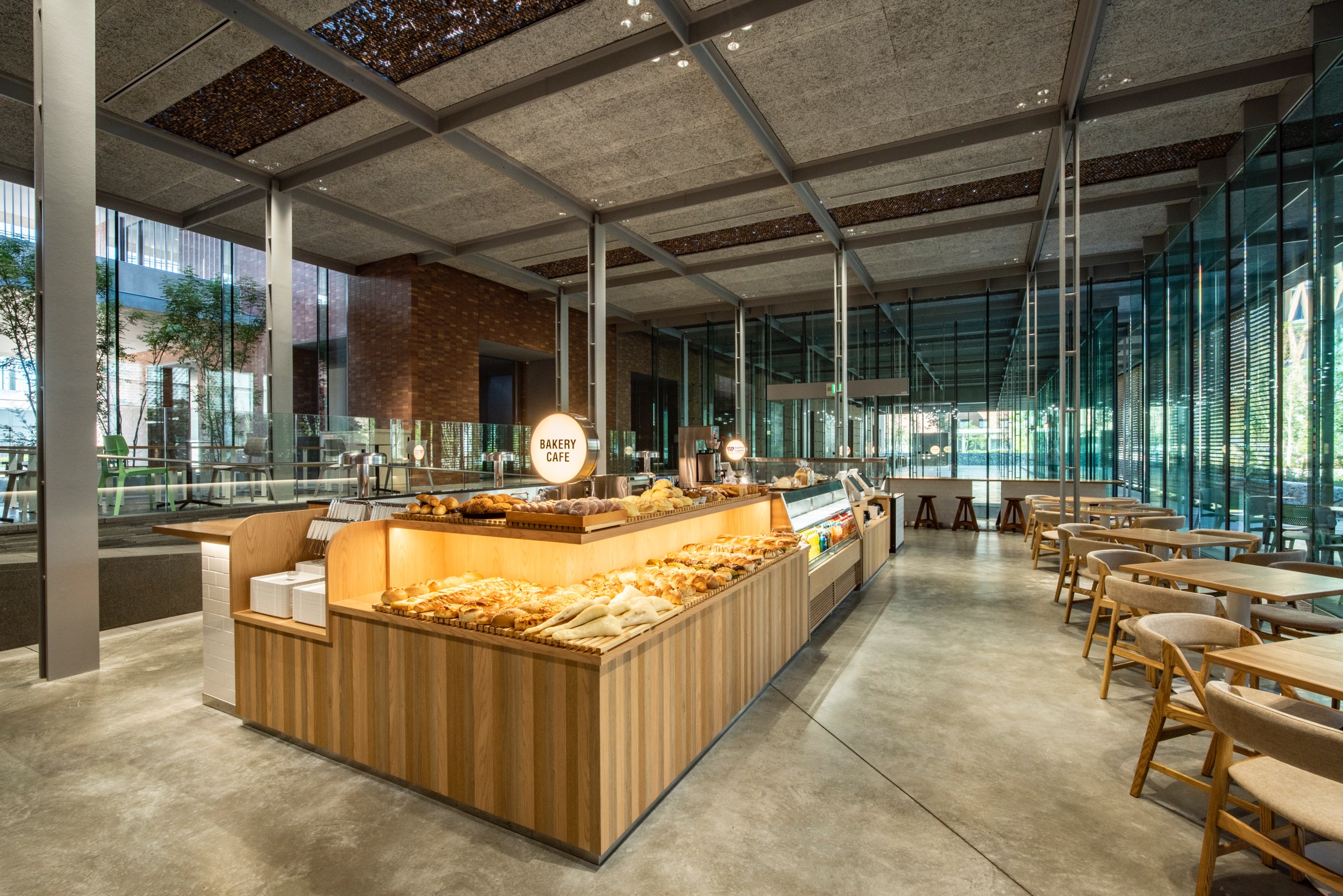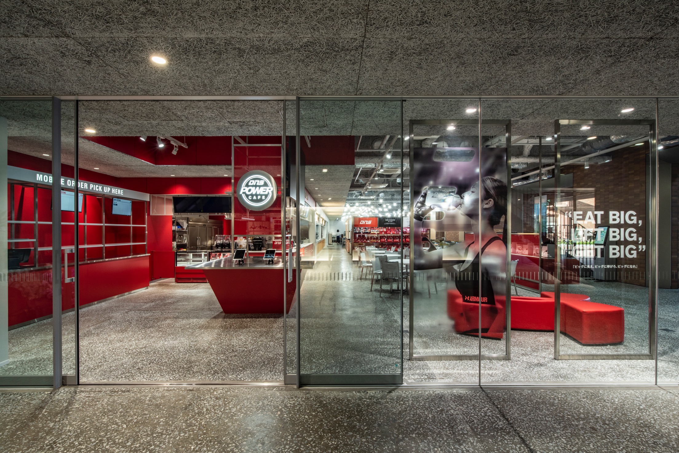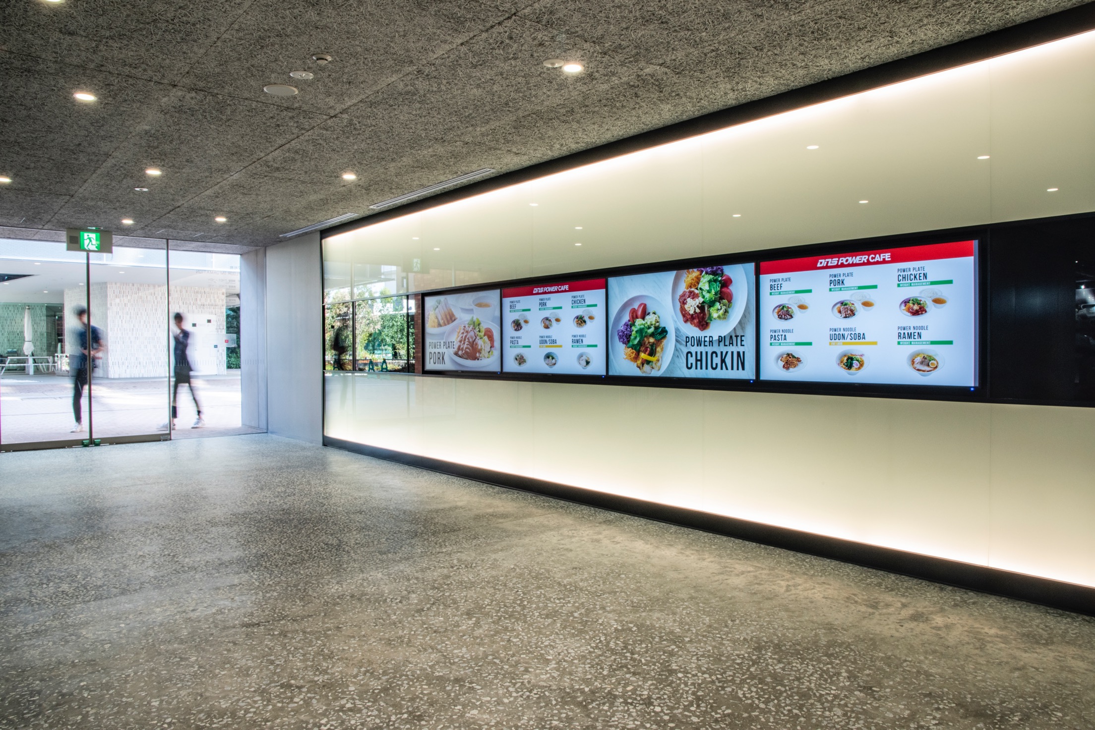 大阪近畿大学のメインとなる学食。スポーツサプリメントブランドDNSによる"アスリートの身体と心のパフォーマンスを整える食事"をコンセプトとしたDNS POWER CAFEを中心に、ベーカリーカフェなどが集合した学食空間。