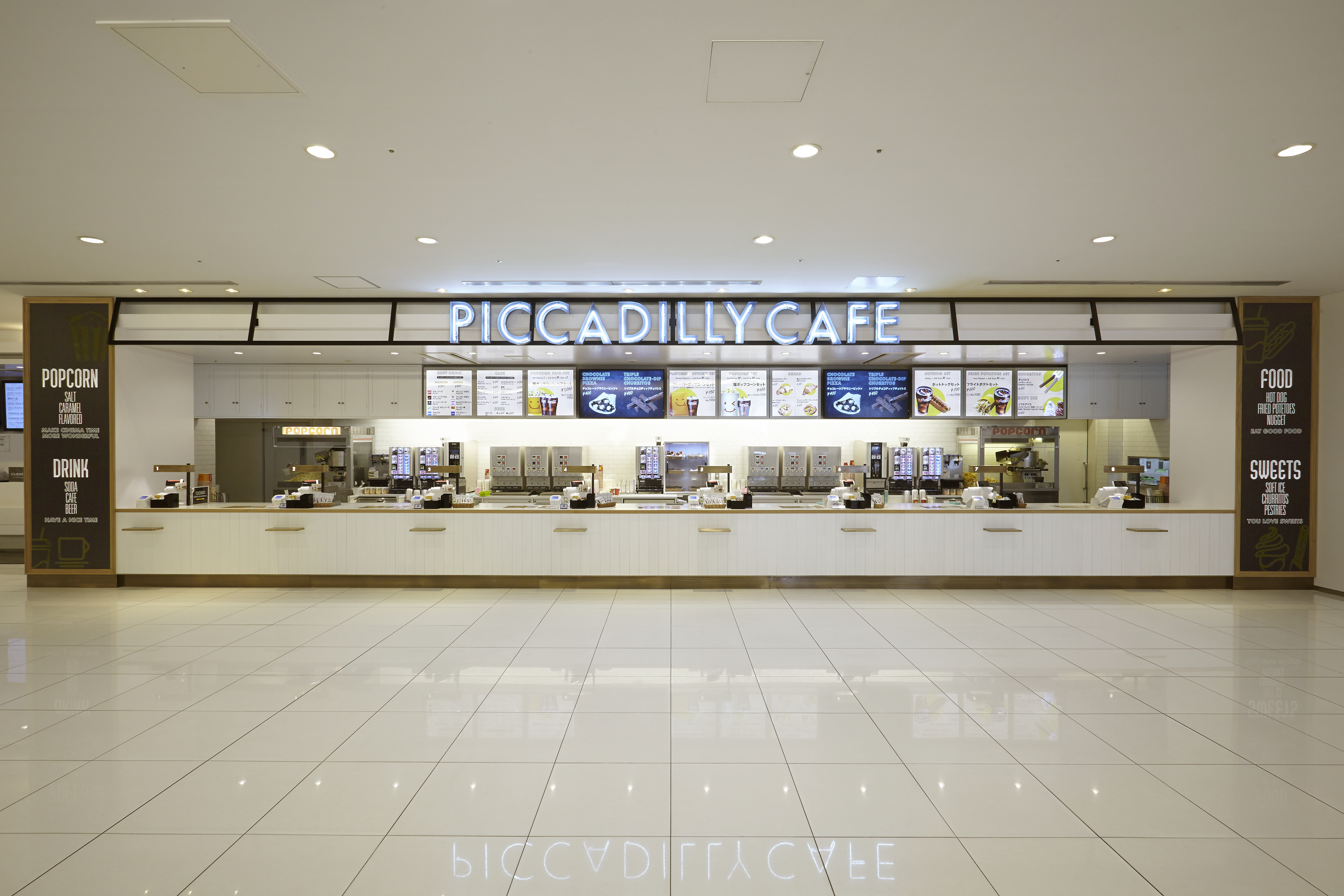PICCADILLY CAFE PROJECTS PICCADILLY CAFE Cafe/Restaurant 映画館コンセッションのクリエイティブディレクション 新宿のランドマークである映画館・新宿ピカデリーのコンセッション(売店)「PICCADILLY CAFE」。映画館ロビーの真っ白な空間の中に浮き上がるように、インテリアやグラフィックデザインをディレクション。映画を楽しむ前に立ち寄りたくなる空間を演出。 Client:株式会社松竹マルチプレックスシアターズ BACK TO LIST RELATED PROJECT 2022.06.17 goma to 2011.11.01 THE SHARE 2023.11.01 Premier Anti-Aging office 2022.01.07 BLUE STAR burger gourmet 113 渋谷宇田川店